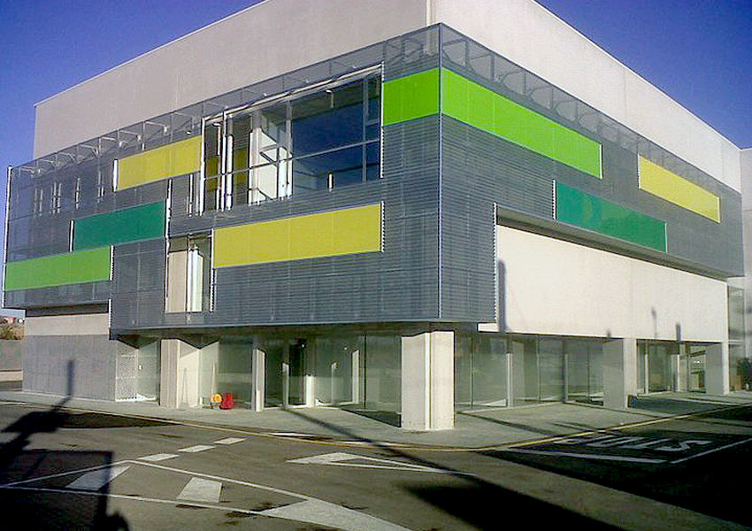 Desarrollo de ingeniería de detalle y fabricación para ejecución de fachada suspendida sobre cerramiento de placa de hormigón, mediante estructura metálica galvanizada atornillada, chapa minionda microperforada, rematería y ventanales de policarbonato.